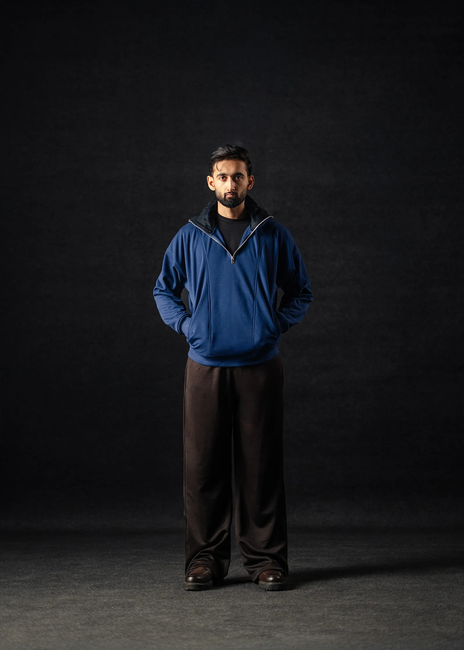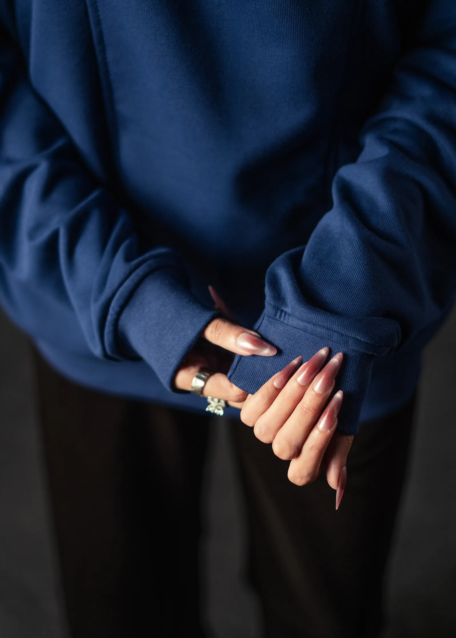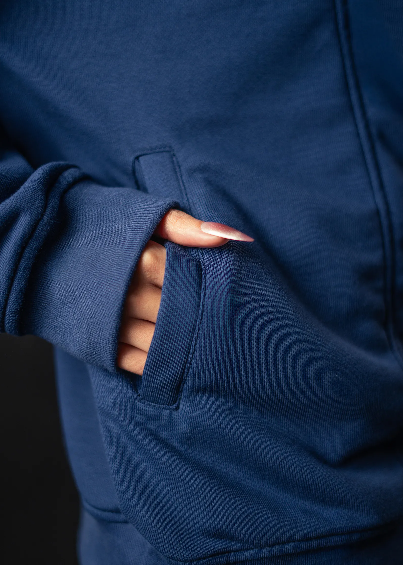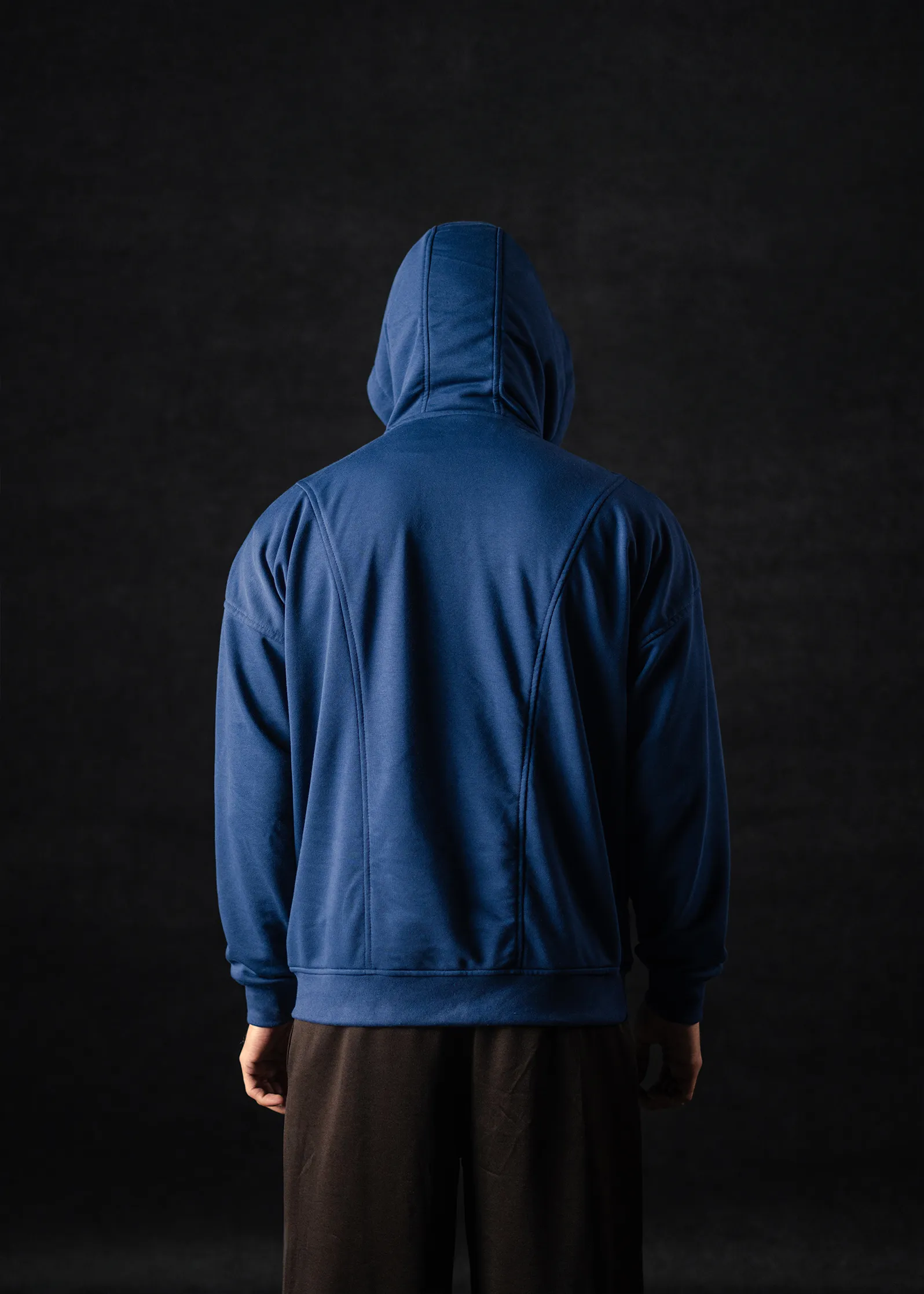 Crafted from 300 GSM French Terry, it delivers a substantial yet flexible feel, maintaining warmth and durability without excess bulk. The deep Navy Blue tone adds understated depth, complementing its sharp silhouette and tactical aesthetic. Ribbed cuffs and bottom ensure a secure, polished finish.