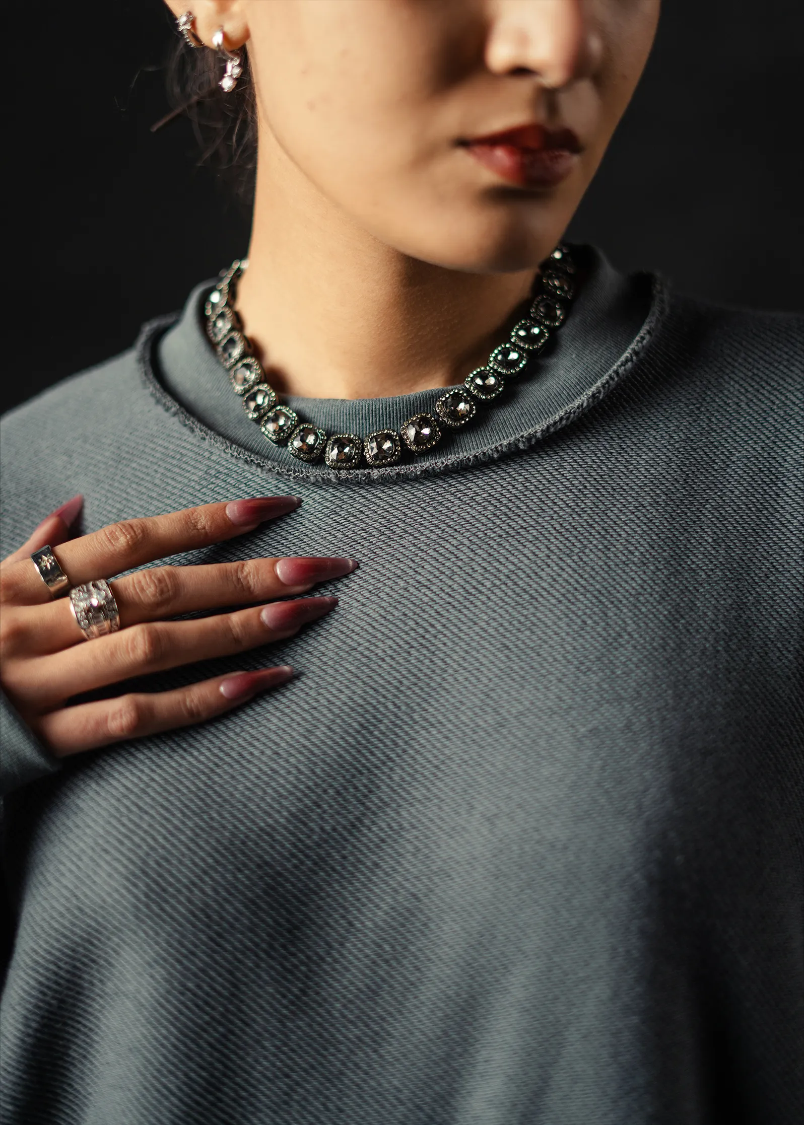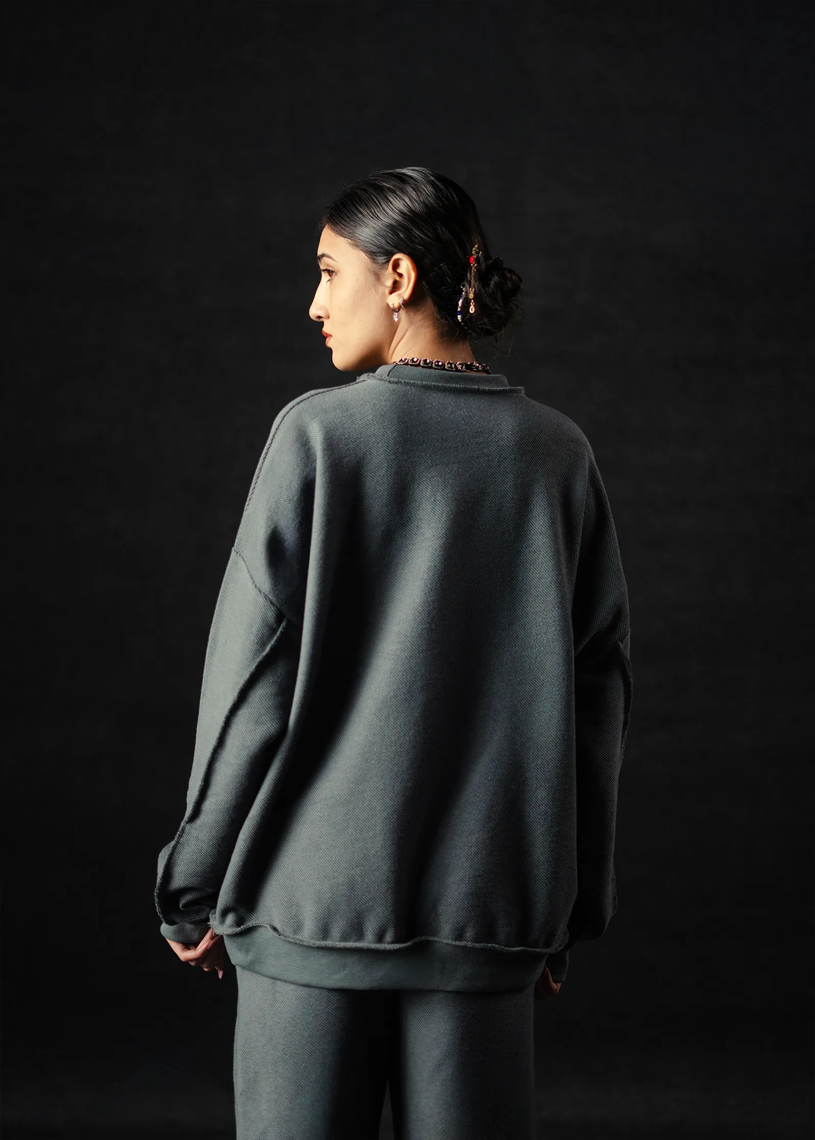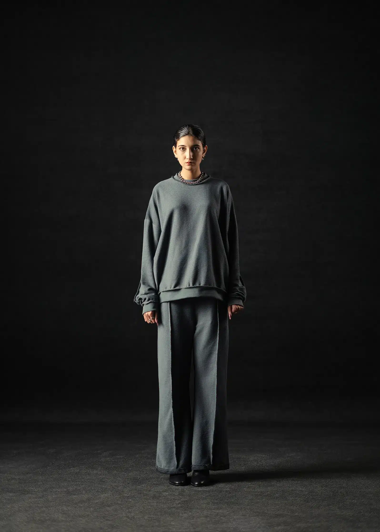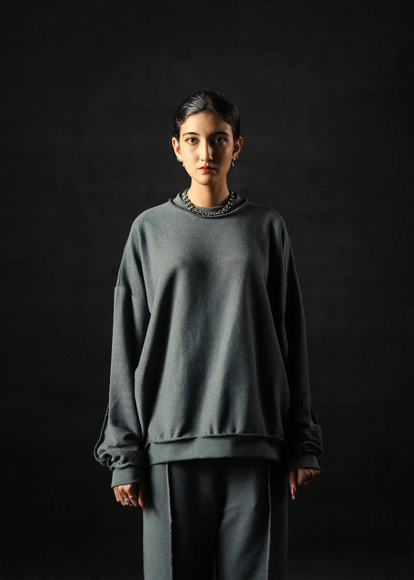 Soft form meets subtle depth. The Graphite Cloud Sweatshirt is crafted from 280 GSM French Terry cotton, featuring a dual-tone weave with a darker graphite base that adds quiet contrast beneath the light grey surface. The result — a refined texture that shifts tone under light, balancing comfort and modern minimalism with oversized fitting. With its breathable terry interior and smooth exterior finish, this piece embodies effortless versatility perfect for everyday wear or layered winter styling.