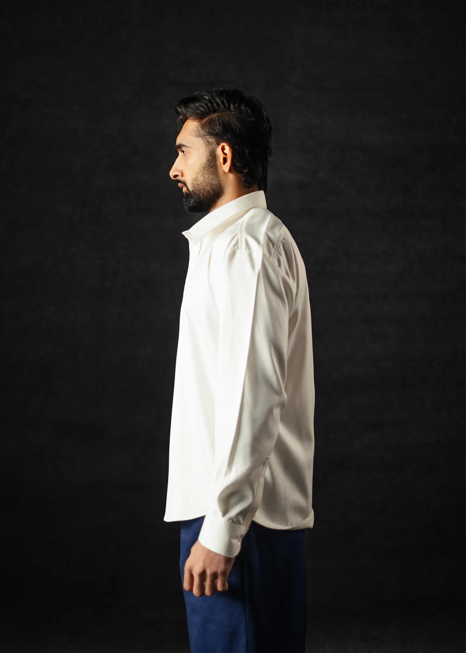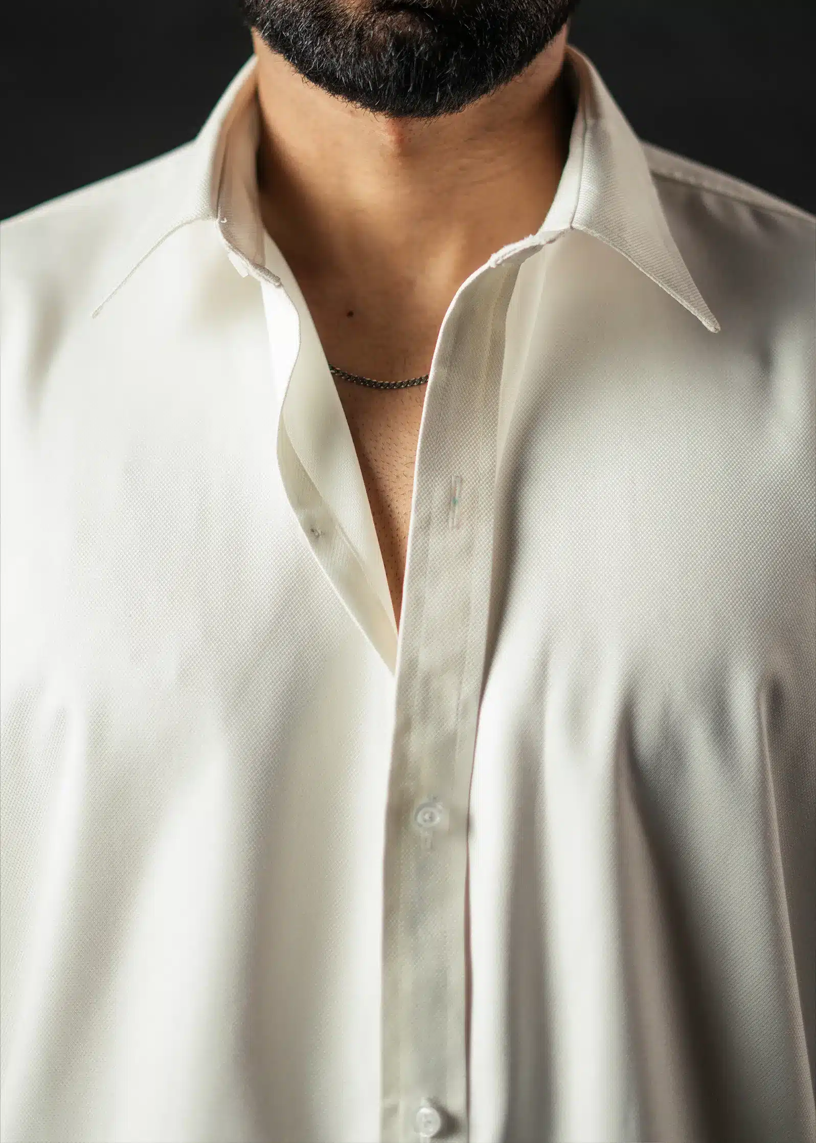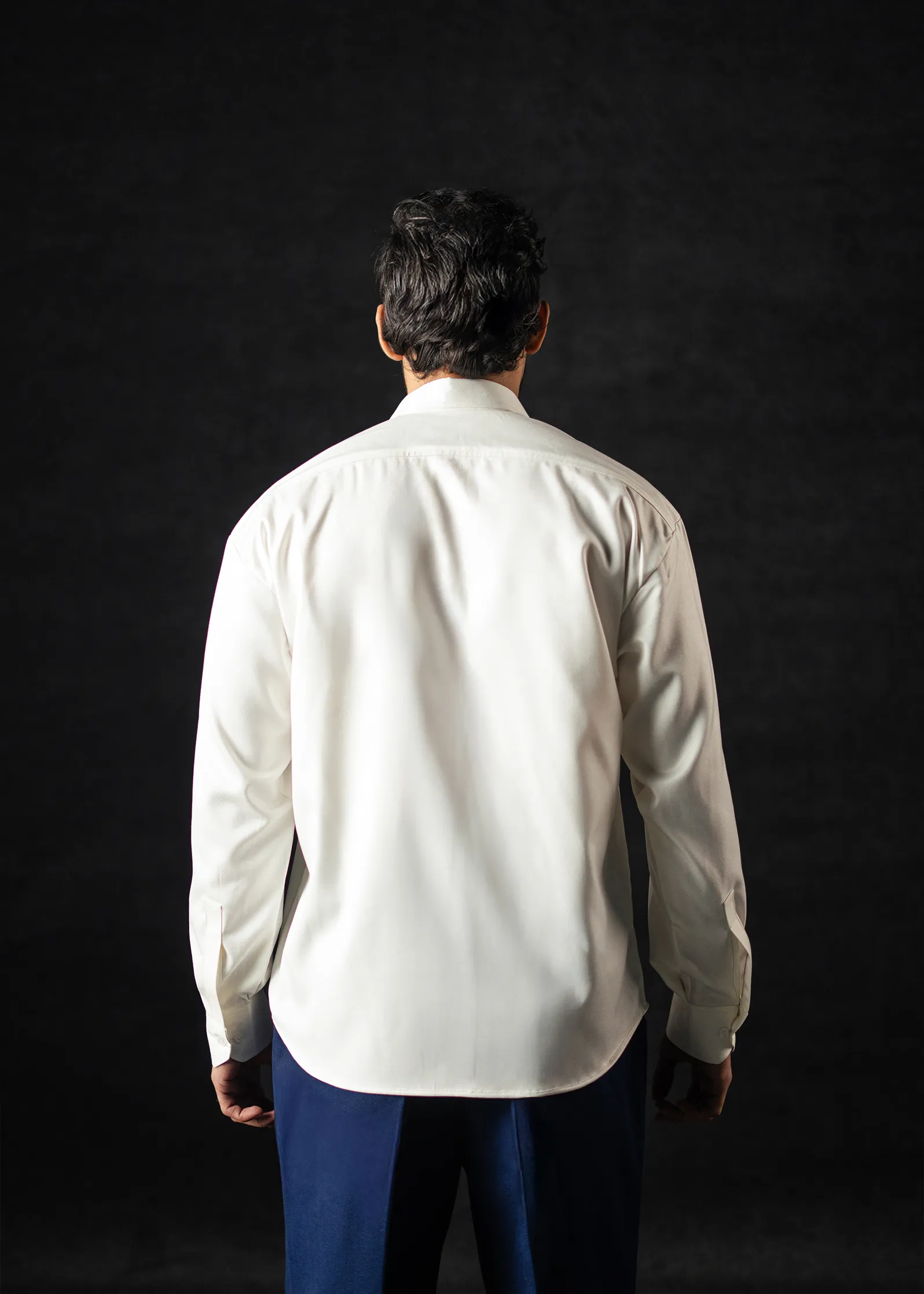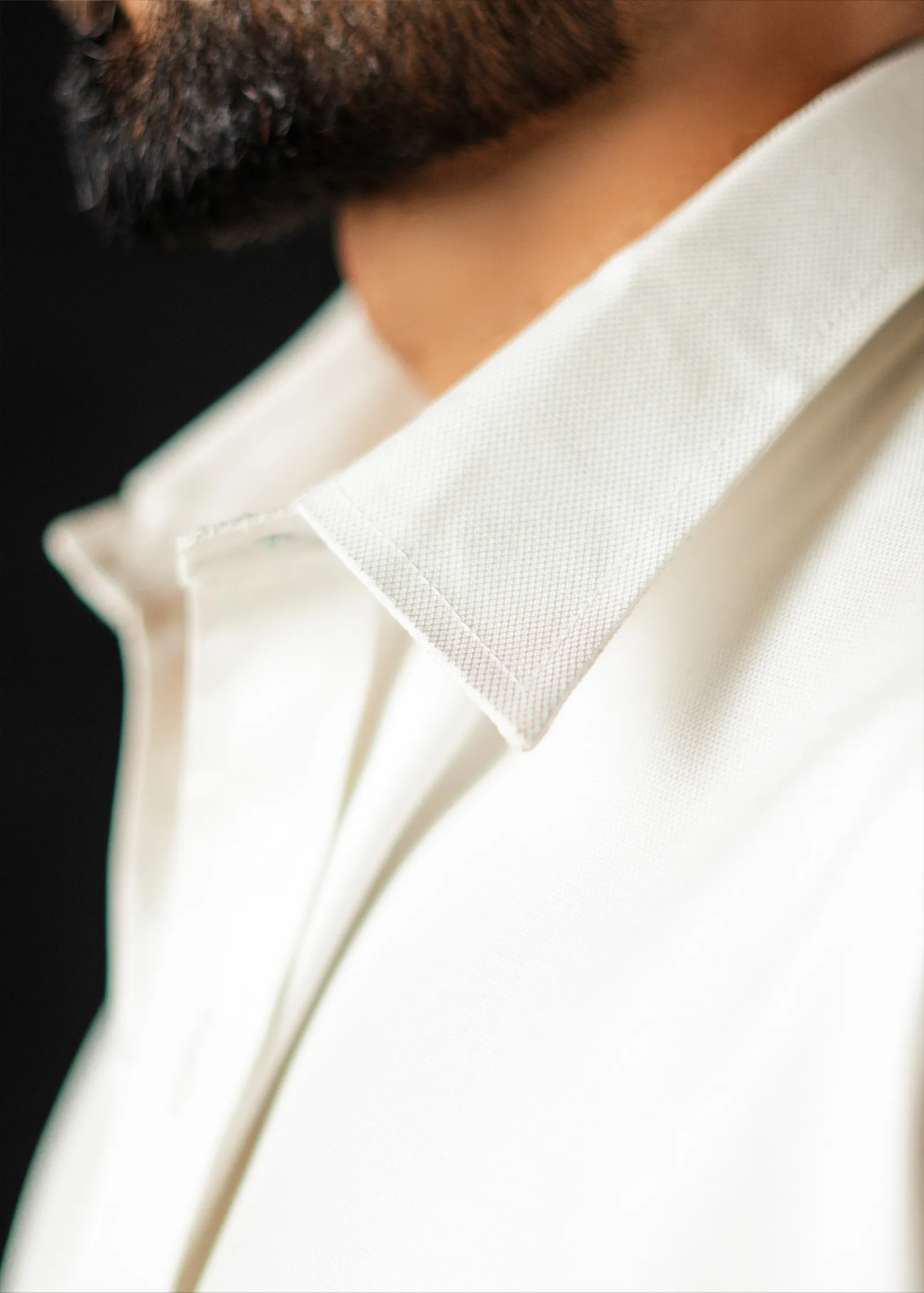 Purity in form, precision in detail. This White textured dress shirt, made from a 180 GSM cotton-poly blend, brings a soft luminosity to classic formalwear. The fine textured weave adds depth and dimension, while the pale tone reflects quiet confidence and refined taste. Lightweight yet structured, the fabric drapes cleanly and stays wrinkle-resistant throughout the day, making it a modern essential for those who value subtle sophistication and versatility.