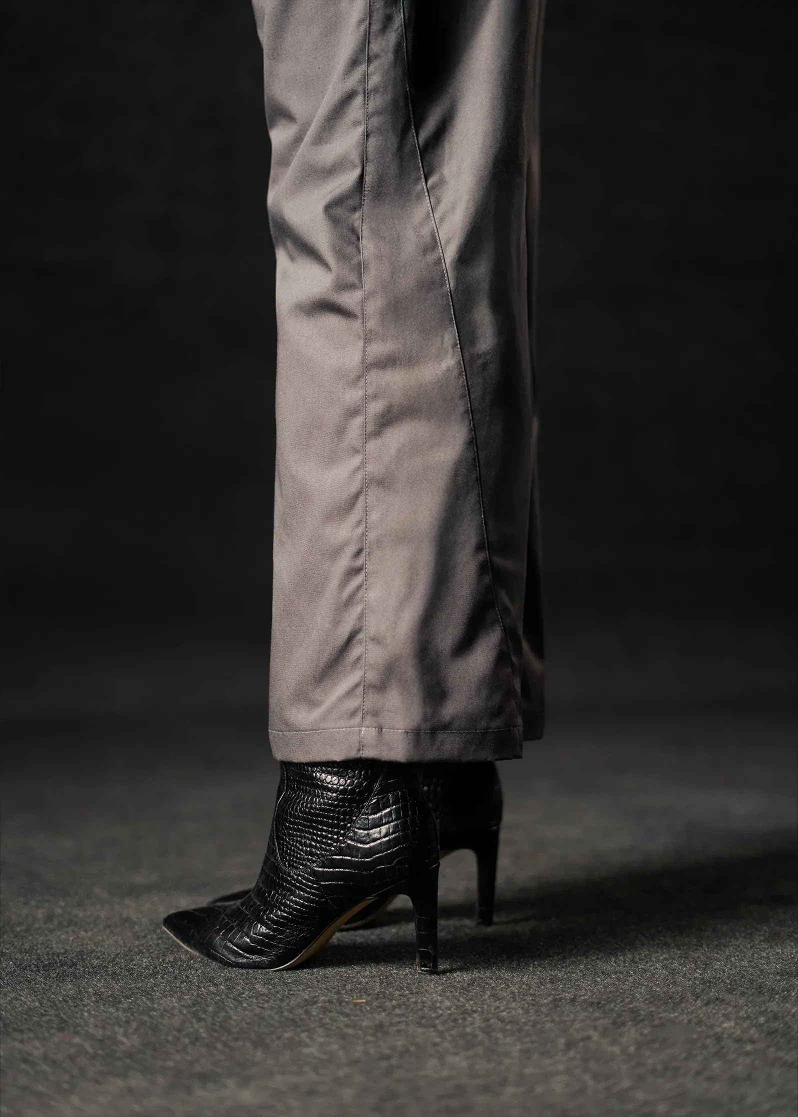 Designed with a tailored boot-leg cut, these pants create a sleek, elongated silhouette while maintaining flexibility through movement. The muted grey tone brings a modern, balanced neutrality to any outfit.