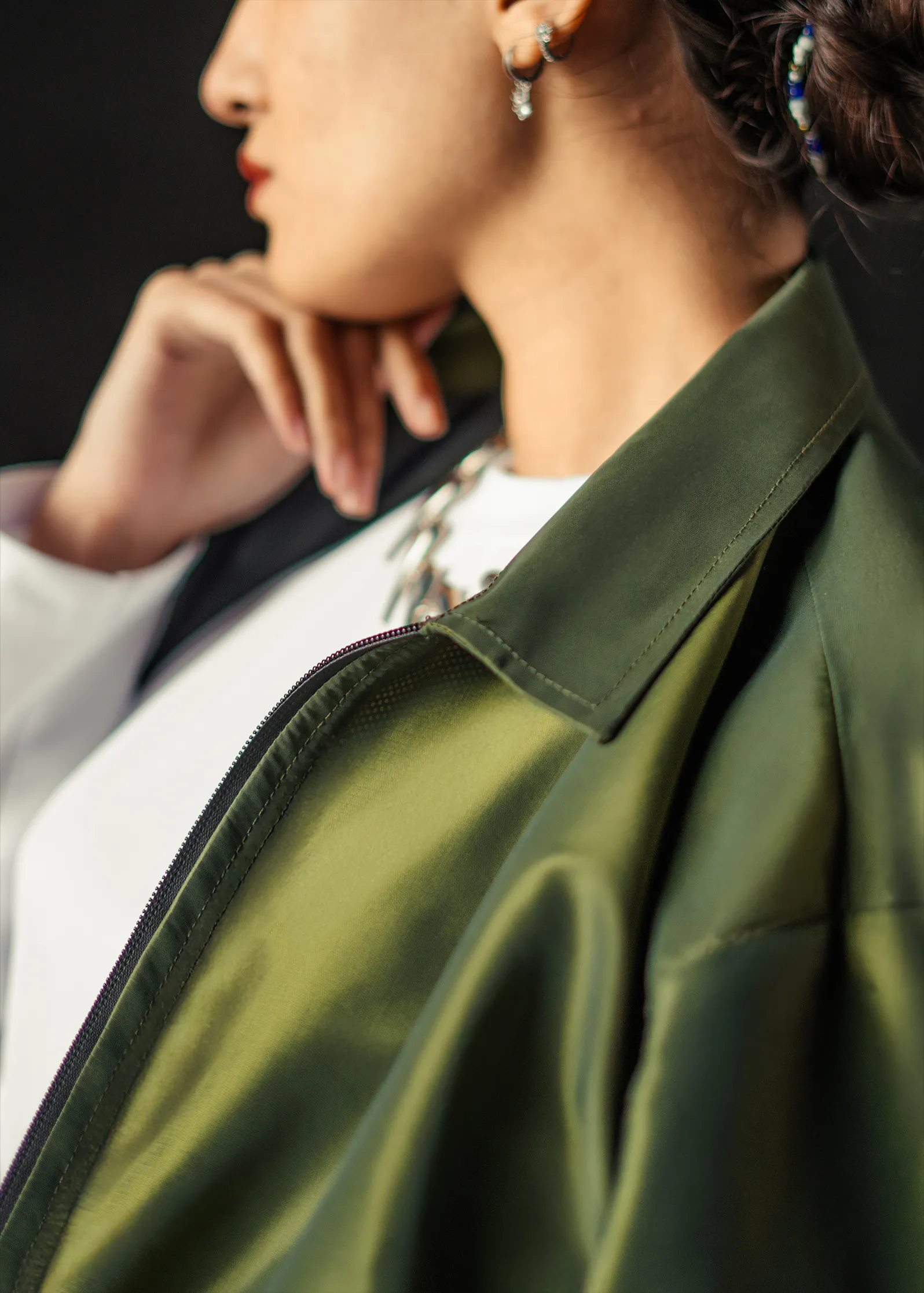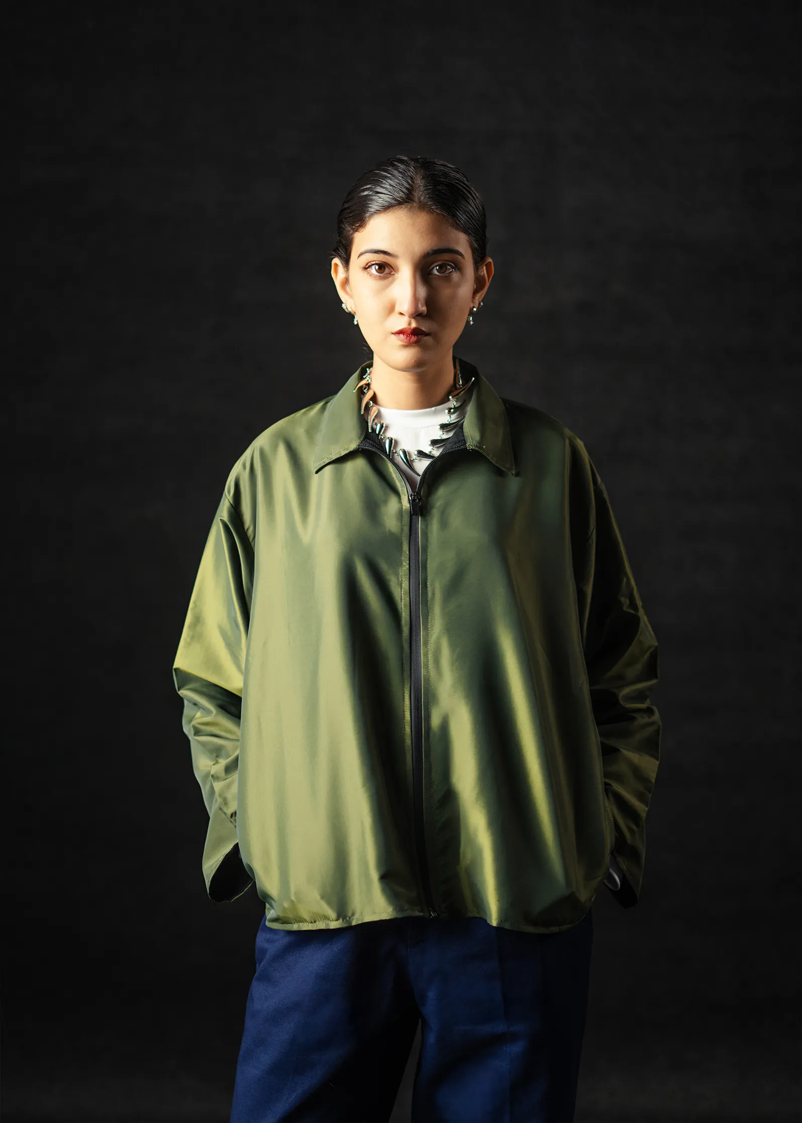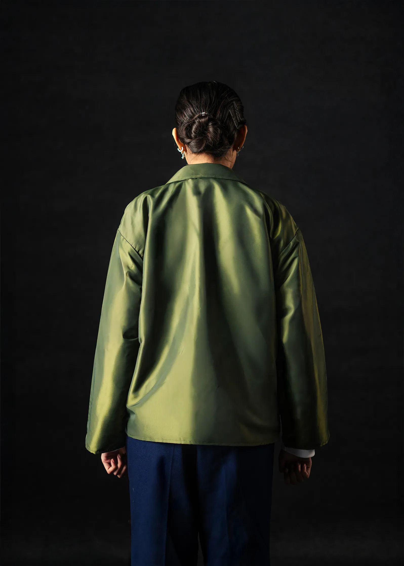 The dual-tone green-gold fabric offers a natural warmth under light – a balance between utility and understated elegance. Ideal for both formal layering and off-duty minimal looks.