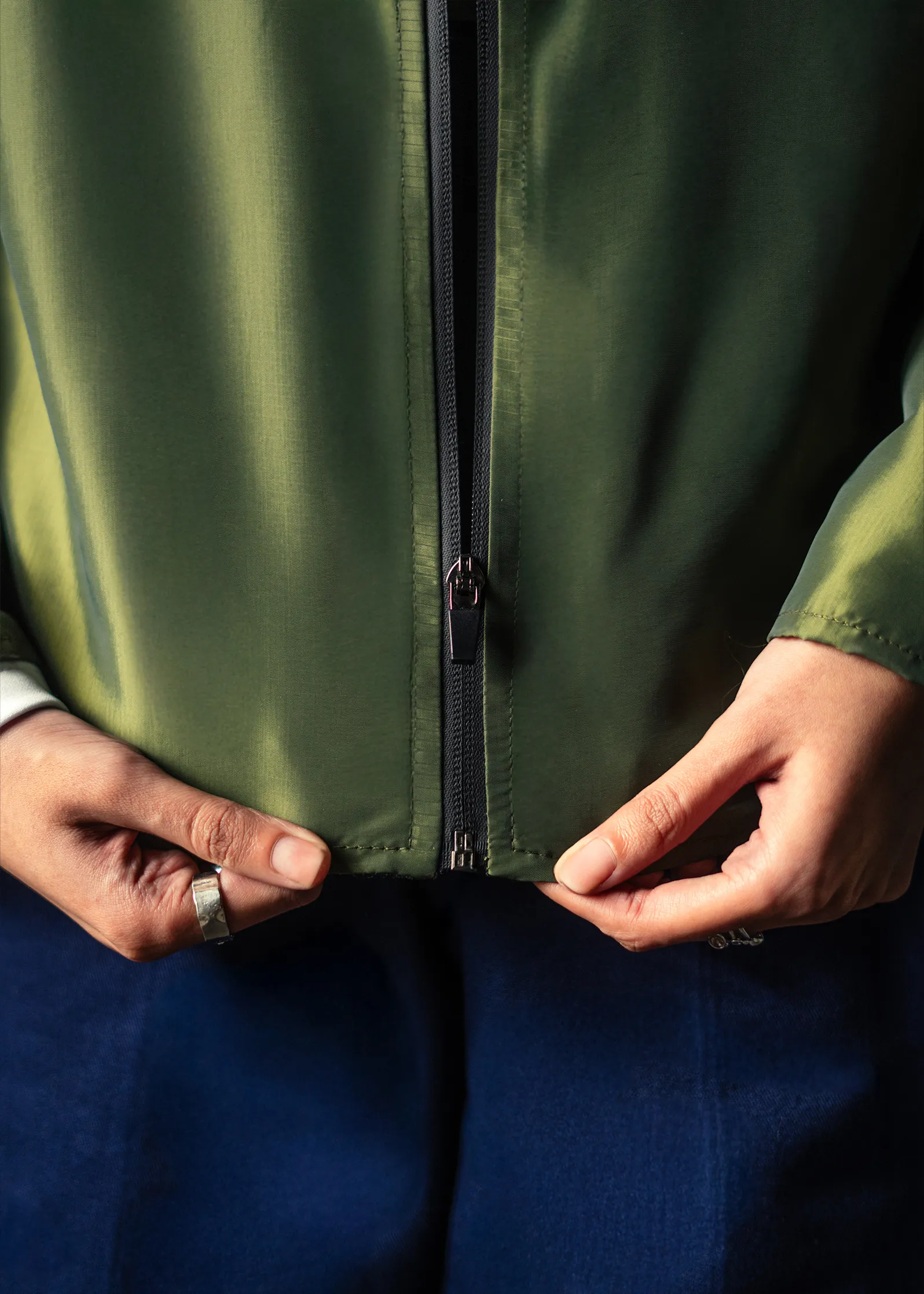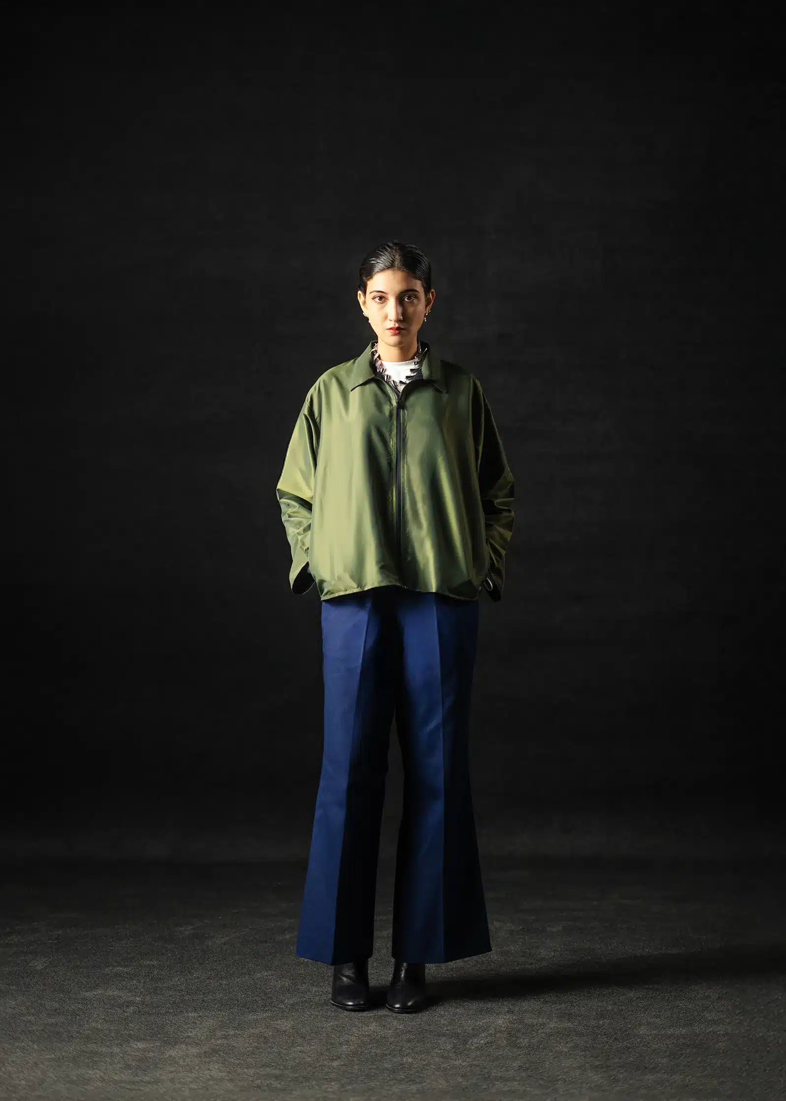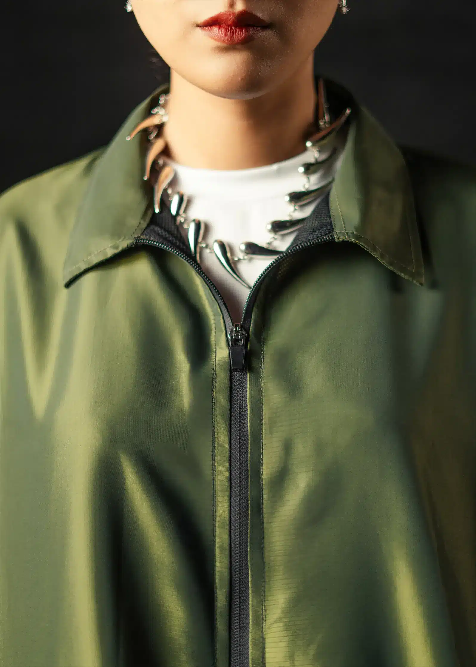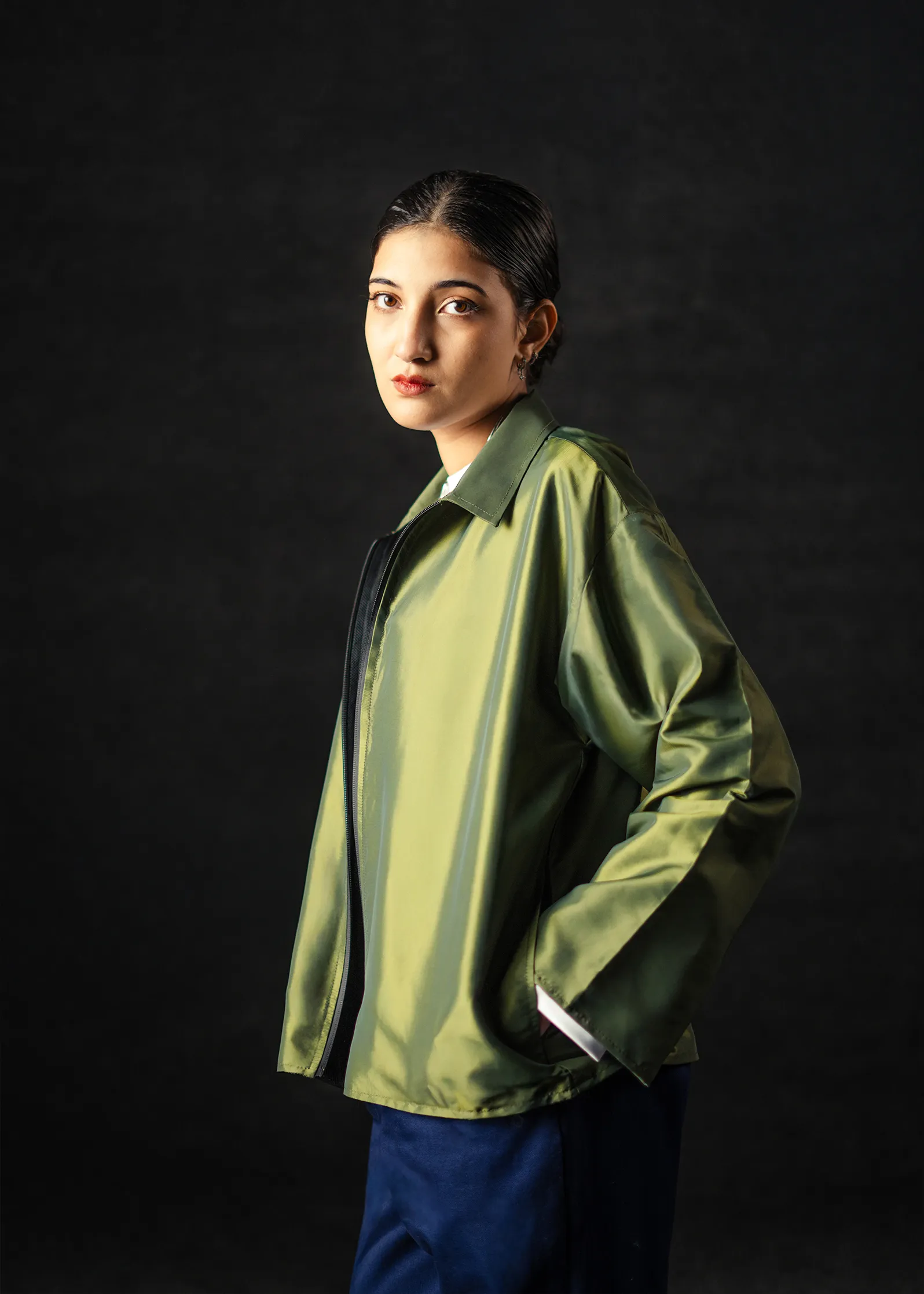The dual-tone green-gold fabric offers a natural warmth under light – a balance between utility and understated elegance. Ideal for both formal layering and off-duty minimal looks.