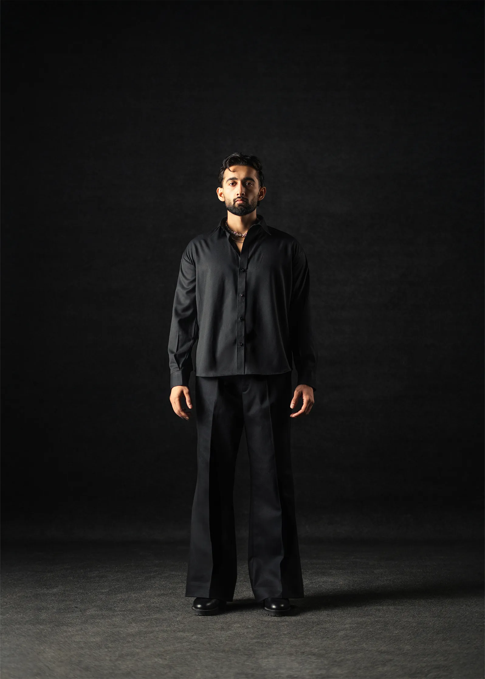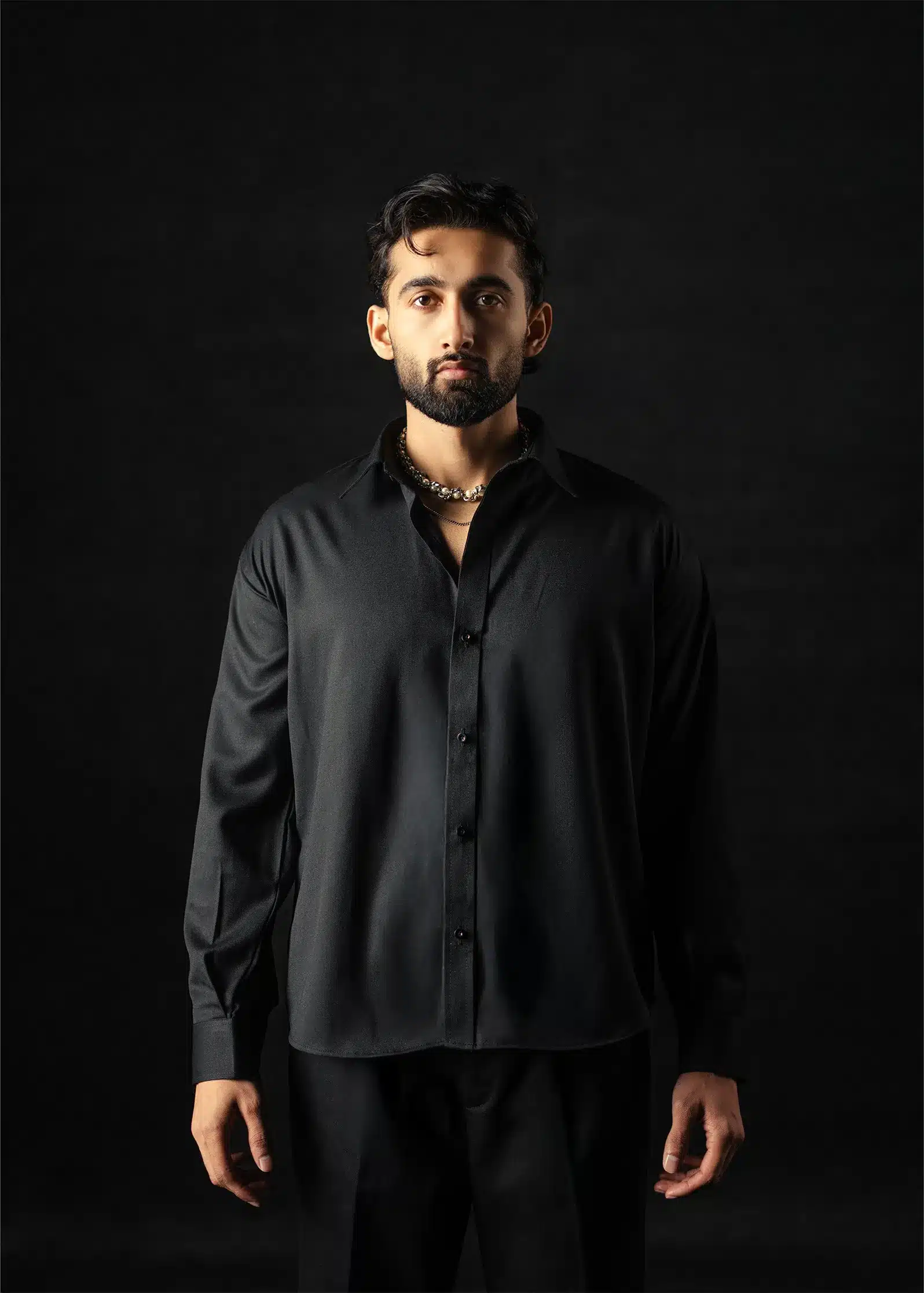 Defined by precision and poise, this Black textured dress shirt embodies the essence of minimal modern tailoring. Made from a 180 GSM cotton-poly blend, it features a refined textured weave that adds subtle dimension to its deep tone. Lightweight yet structured, it delivers all-day comfort while maintaining a crisp, formal silhouette. The matte black finish evokes quiet strength and versatility equally suited for evening formals or elevated monochrome styling.