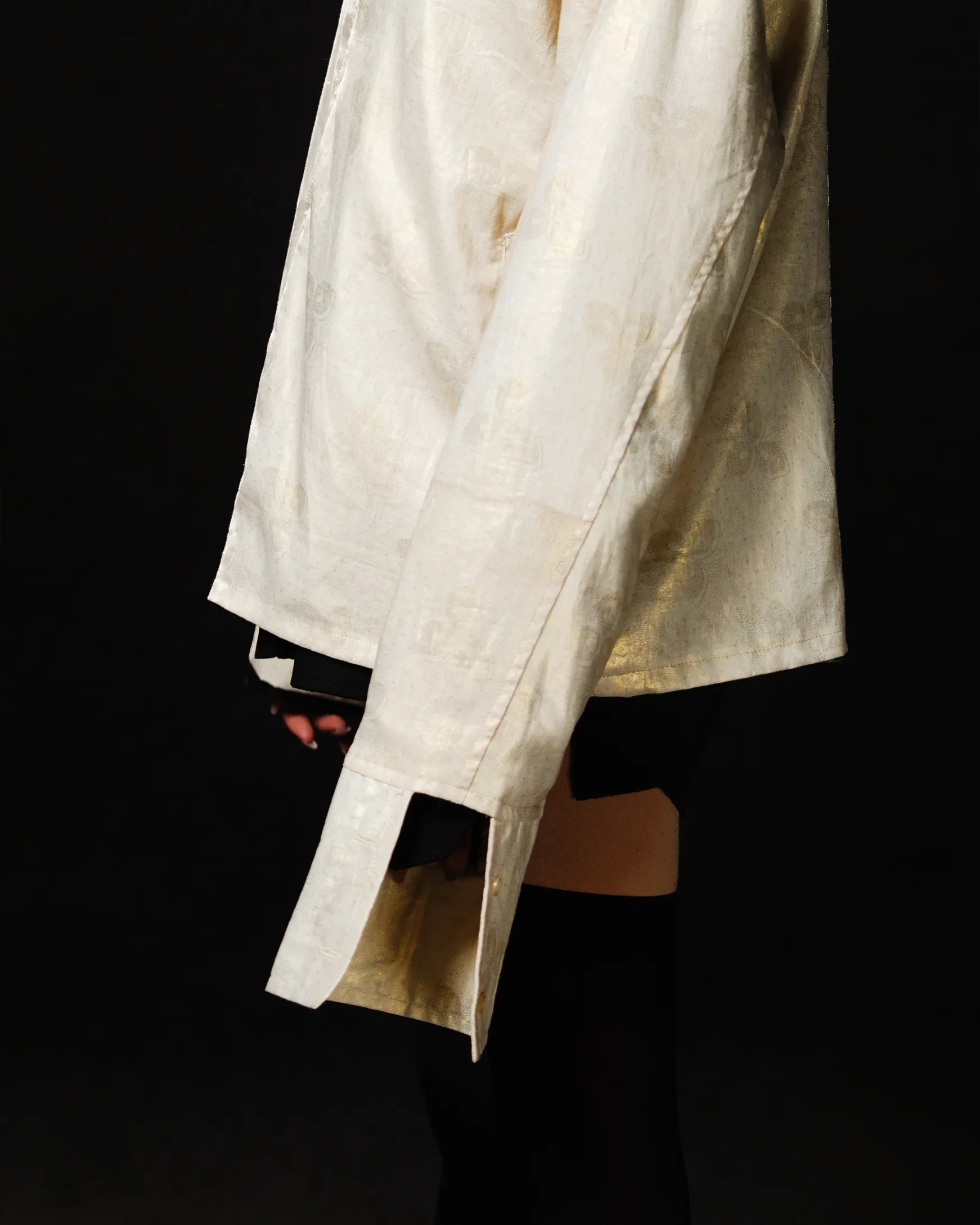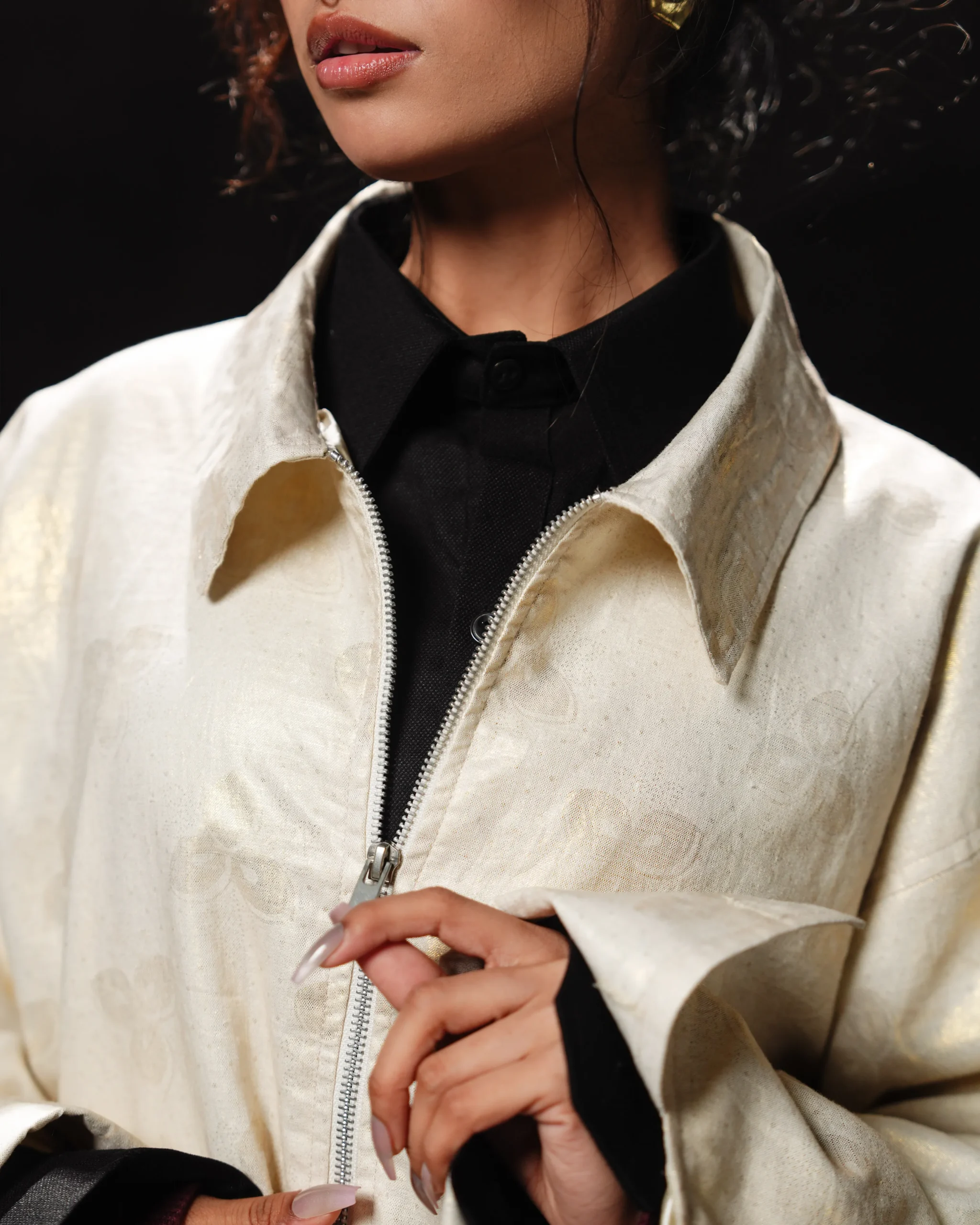 Ivory Sheen Lightweight Jacket is designed to balance fluid movement with refined structure. Crafted from a lightweight, softly lustrous fabric, it feTheatures a smooth surface that catches light gently, creating depth without excess. The relaxed silhouette allows for easy wear while maintaining a clean, composed profile.